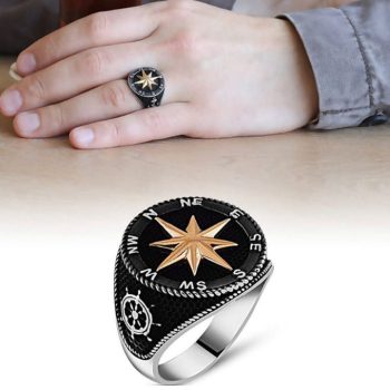 925 Sterling Silver Ring Black Compass Bronze Star Jewelry Men’s – SV24